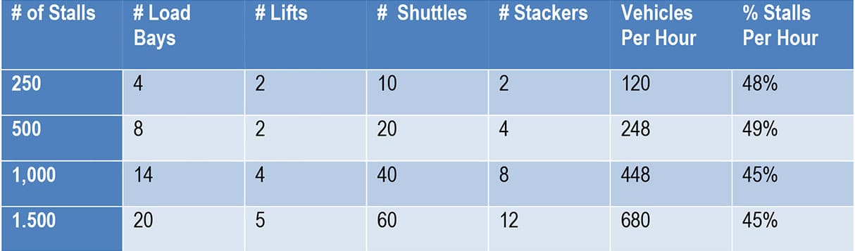 Below is a table with some examples of various sizes of fully automated garages with their associated equipment and automated system throughput. Please note: These are not maximum throughput, but rather designed to meet a site’s Peak-Hour-Demand.