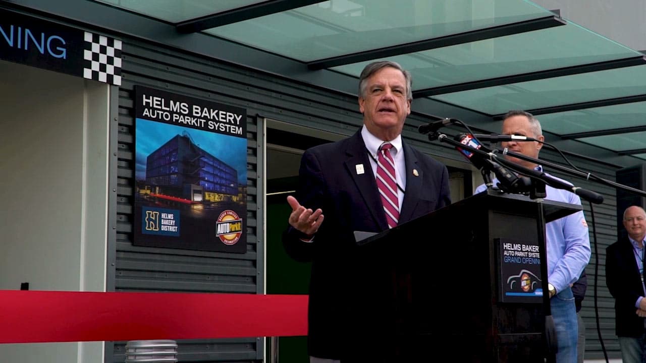 Mayor Jim Clarke participated in the ribbon cutting last Friday for the new automated parking garage in the Helms Bakery District, 8758 Venice Blvd. The project was constructed by AUTOParkit™. To access the garage, drivers enter through a traditional garage door, turn off their car, and walk a few steps to a kiosk where they activate the AUTOParkit™ System. Then the driver’s car is safely whisked away by an industrial, commercially adapted high tech system. There are no attendants required with an AUTOParkit™ System, self-monitored with notifications on performance, sent electronically via email, text or automated call.